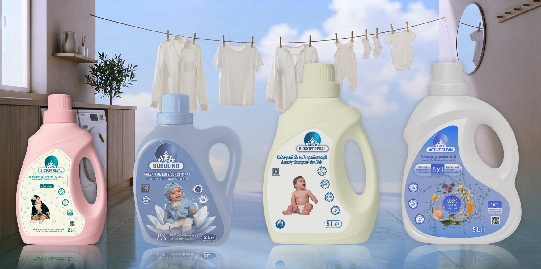 AMZA CLEANLINE oferă soluții de curățare pentru rufe cu utilizare zilnică — formule eficiente care îmbină performanța curățării profunde cu prospețimea de durată.
